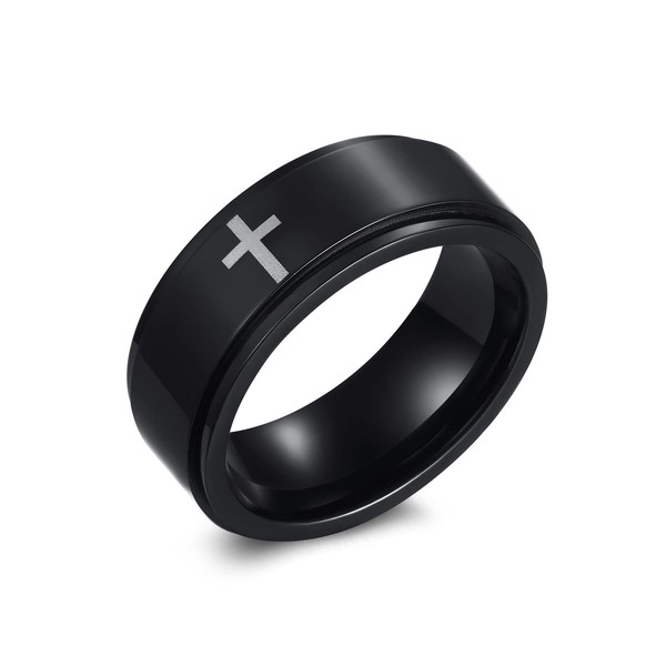 8mm Titanium Steel Black Fidget Ring Engraved Small Cross Stainless Steel Spinner Rings Stress Relieving Anxiety Ring Engagement Wedding Promise Band for Women Men Boys Girls Size 7