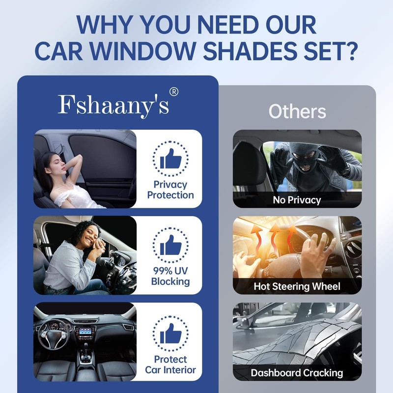 - Enhanced Privacy Protection: FSHAANY'S 8-piece car privacy window covers provides complete coverage for your car, creating a comfortable and private space. The opaque design makes it ideal for camping, napping, and relaxing