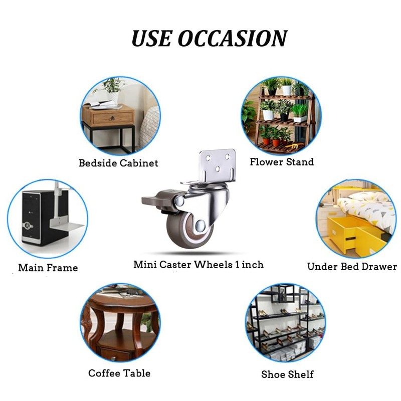 - [Multiuse] These L-Bracket side mount casters work perfectly for small DIY projects, baby bed,furniture, under bed drawers, dresser, musical instrument box, tool box, cart, light machinery, speaker, cabinet, bracket, workbench, trolley, mobile workstations, and wooden box, desk, frame etc.