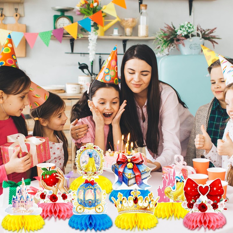 - 【Enchanting Princess-Themed Designs】This set includes beautifully designed honeycomb centerpieces featuring various princess-themed patterns like castles, crowns, dresses and pumpkin carts. These double-sided decorations create a magical focal point for any party.