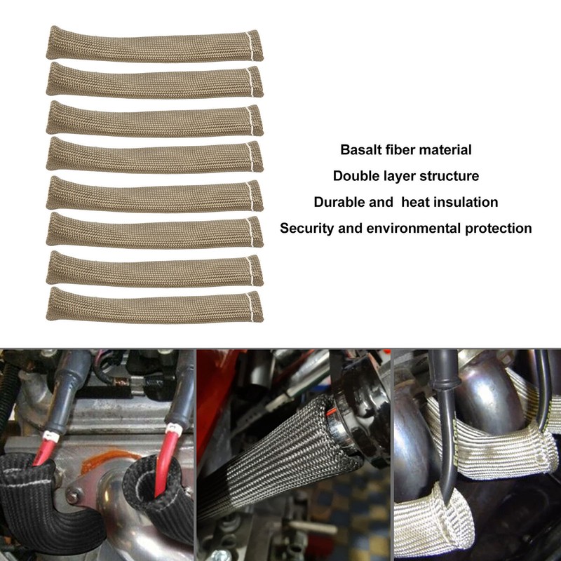 1、Fitment: The spark plug wire boots fit for fits most hot rods and classics engine, and can be matched with 90 degrees, 45 degrees straight spark plug. 2、Function: Protects spark plug sheath and spark plug wires to prevent engine and exhaust overheating also improve engine performance. 3、Stable Performance: Spark plug heat cover can withstand heat up to 2500°F intermittent, effectively flame retardant, and protect plug wires. 4、Material: This spark plug heat cover is made of basalt fiber with double layer structure for increased durability, heat insulation, high temperature resistance, safety and environmental protection. 5、Easy Installation: Just slip the large end over the boot. Then carefully slip the ringed end over the boot that connects to the spark plug.