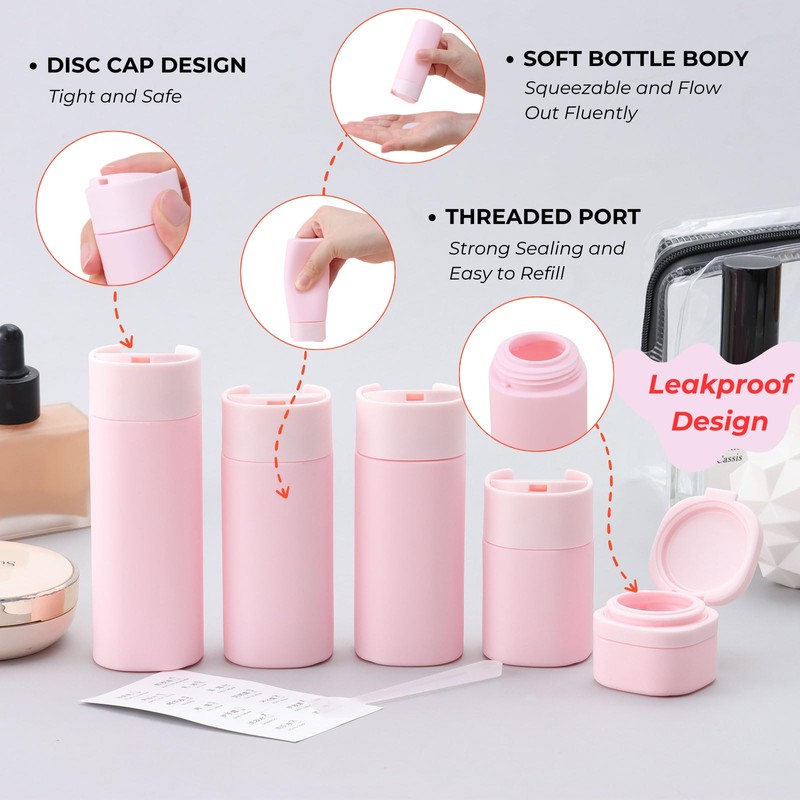 - 💧 Leakproof Disc Cap: These makeup bottles are made of PP plastic, waterproof and will not easily break or deform. Each container is designed to disc cap that with a threaded port inside, strong sealing, tight and safe. The squeezable soft bottle helps the lotions flow out fluently.