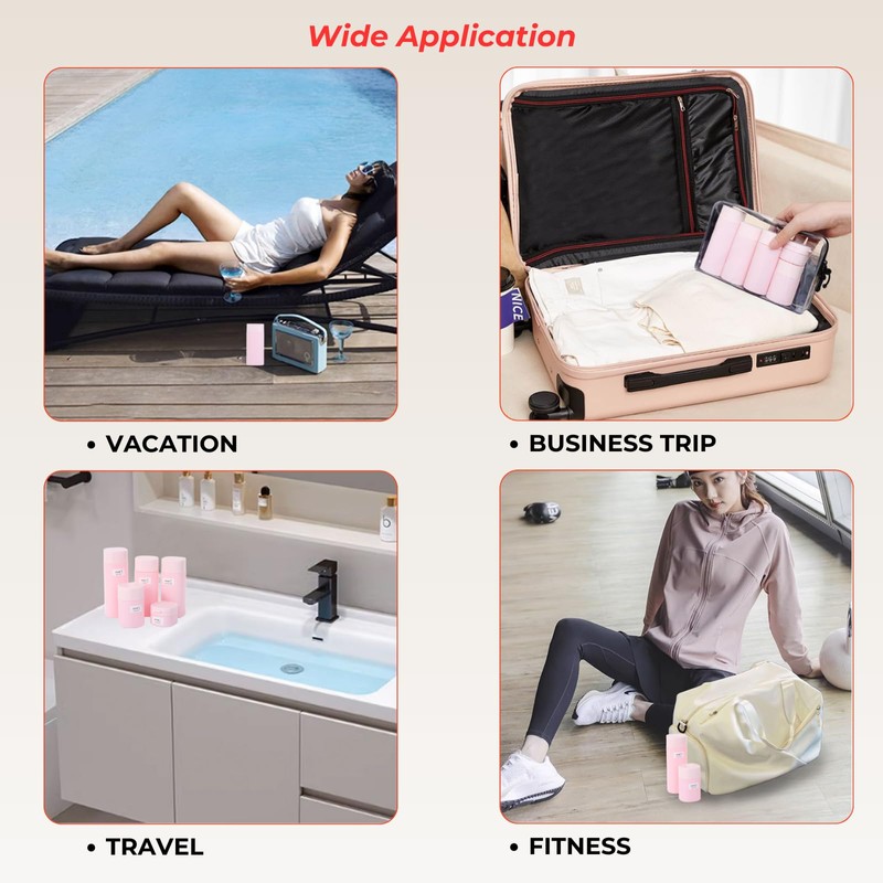 - 💃 Wide Application: All travel accessories are storaged in a transparent zip bag, tidy, clear and save space. The option label helps find more easily. Suitable for refilling proper toiletries when you have a travel, vacation, fitness or outdoor activities. You don't need carry extra toiletries anymore.