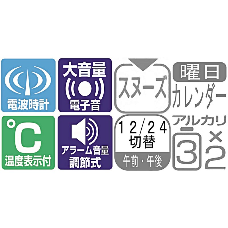 • Functions: Radio clock, electronic sound alarm, volume (large and small) switchable, 12 (am/pm), 24-hour display switchable, calendar display, temperature display, lights included, snooze, alarm auto stop, alarm monitor