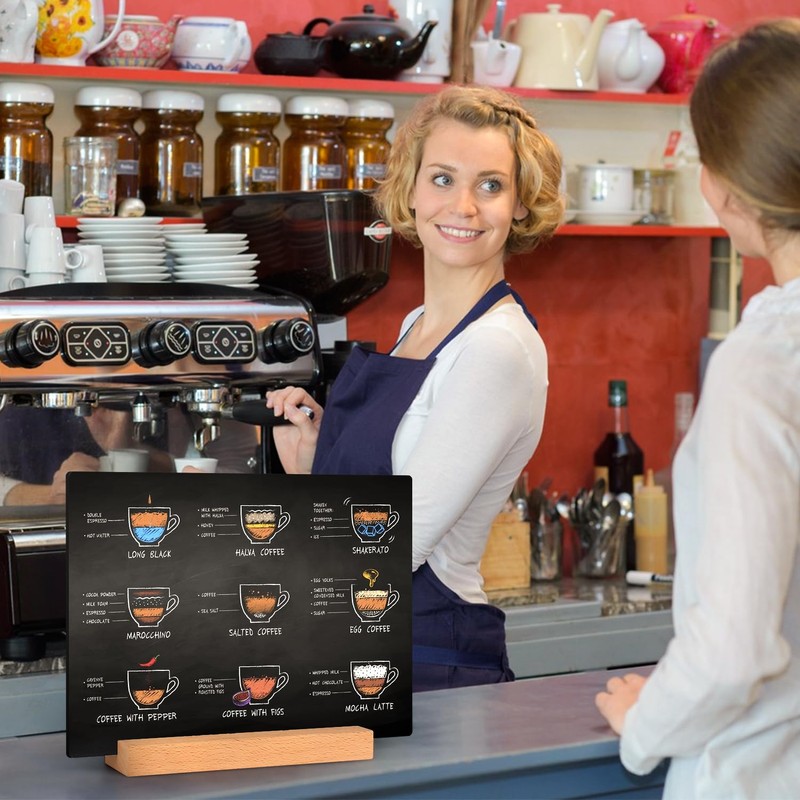 - 【Application Scenarios 】 Desktop chalkboard signage creates stylish artistic displays for your home, restaurants, coffee shops, weddings, menus, bars, fundraising events, to-do lists, birthdays, love letters, graduation parties, recipes, photo shoots and more.