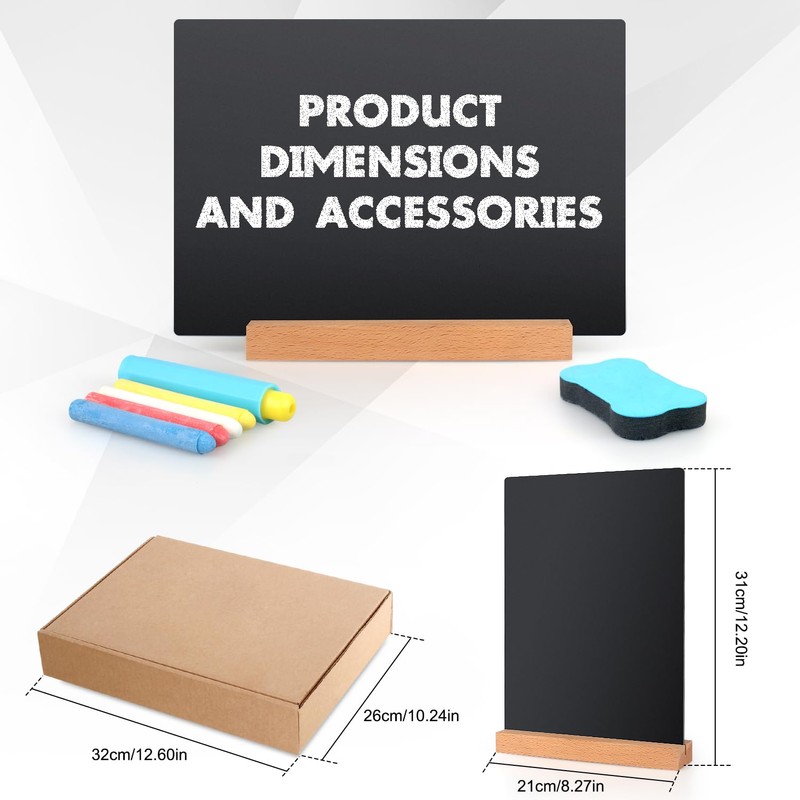 - 【Packing List 】 Measures 8X12 inches, 1 x A4 small chalkboard with wooden stand, 1 erasable liquid chalk, 2 x double-sided velvet cloth. EASY TO ASSEMBLE - Just slide the chalkboard into the groove. If you have any questions, please contact us.