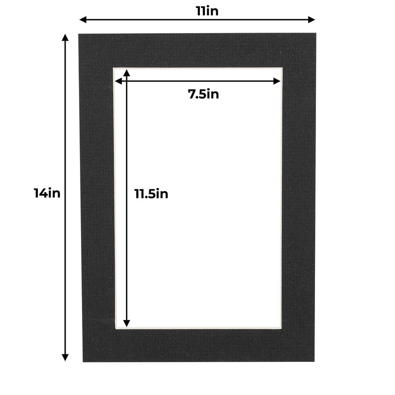 THIS IS FOR A PACK of 10 Mats only w/o backing boards or bags, Featuring a picture opening for a 8x12 inch photo, and a 11x14 inch overall size. Picture openings are cut 0.5" smaller than the photo size advertised to overlap the photo and help keep it securely in the frame. MADE TO DISPLAY a 8x12 Photo and fit in a standard 11x14 Picture Frame. Great replacement for damaged, dirty, or faded matting in your old frames. PREMIUM QUALITY: Our precut photo matboards are acid free & precision cut with a 45 degree bevel by machine for perfect corners and NO over-cuts every single time! PRECUT ACID-FREE MATTE BOARD COLOR is a vibrant Textured Black. All of our Precut Matboards are proudly MANUFACTURED IN THE USA.