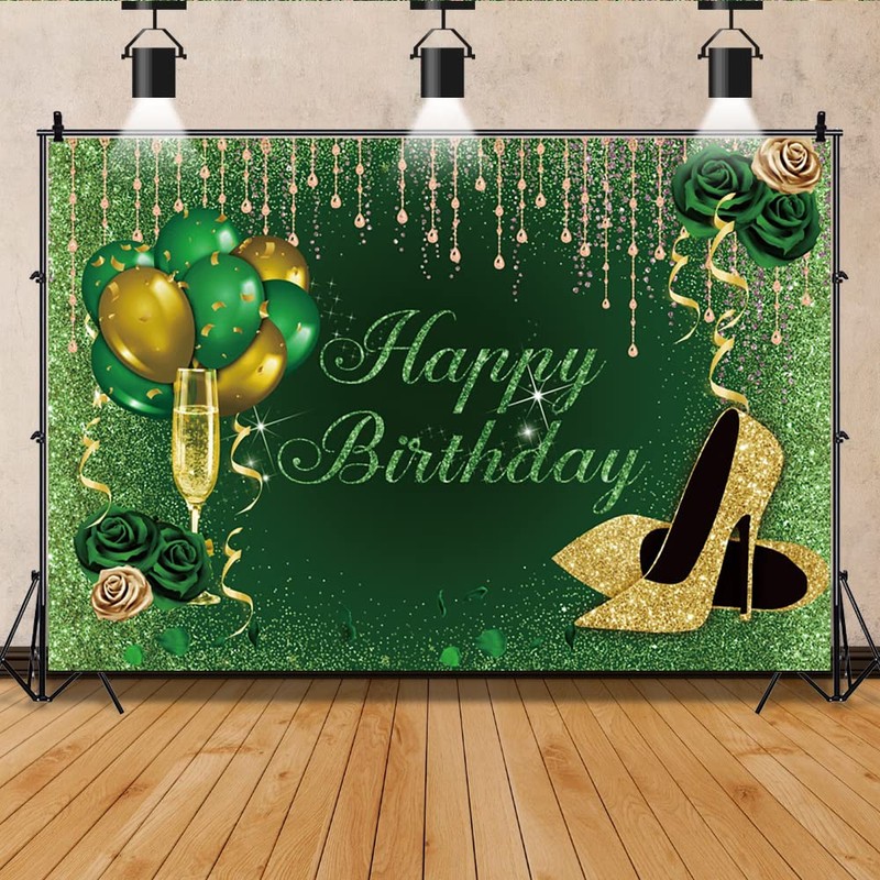 8x6ft Green Happy Birthday Backdrop Golden High Heels Champagne Glasses Glitter Sequin Photography Background Green Rose Shiny Balloons Adults Women Birthday Party Decorations Photo Booth Props