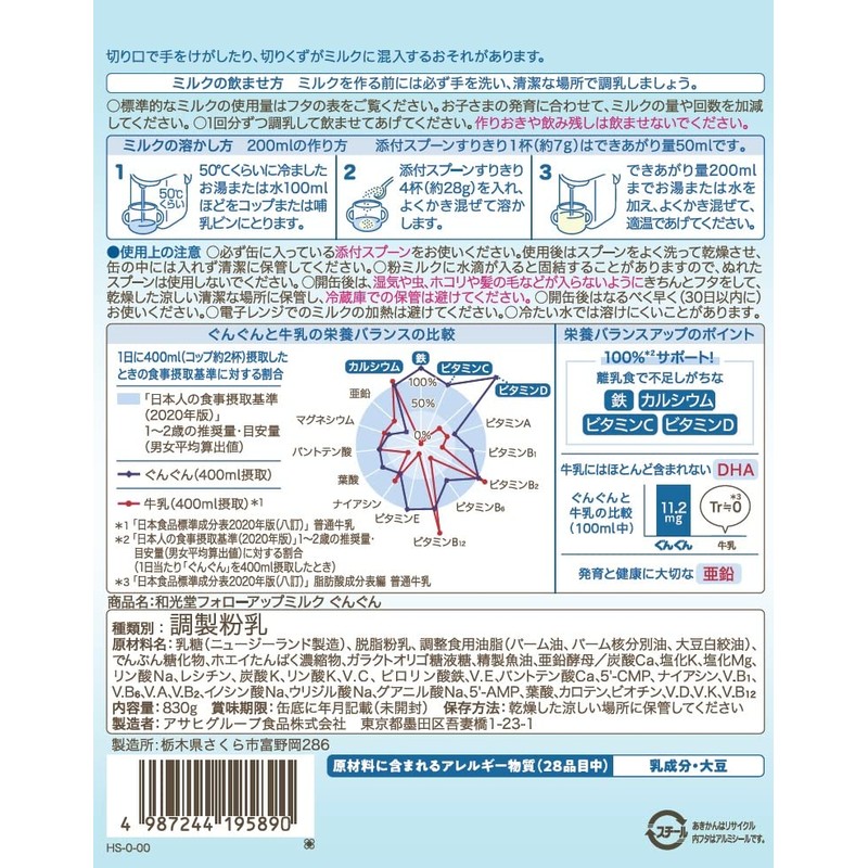 • ▼離乳食が3回食になる満9か月頃からの成長期に、牛乳や食事では不足しがちな栄養をおいしくサポートするミルクです。牛乳では摂りにくいDHAを配合し、1日に400ml飲むことで鉄・カルシウム・ビタミンC・ビタミンDは食事摂取基準1〜2歳の推奨量・目安量に対して1日分を100%サポートし、発育に大切な亜鉛を新たに配合しました。