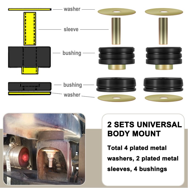 - PACKAGE INCLUDE: 4 plated metal washers, 2 plated metal sleeves, 4 bushings. Universal transmission and motor mounts cab/body and bed mounts restorations daily drivers custom bodies or “kit cars”. Also can be used for air compressors tool boxes generators independent engines, etc.