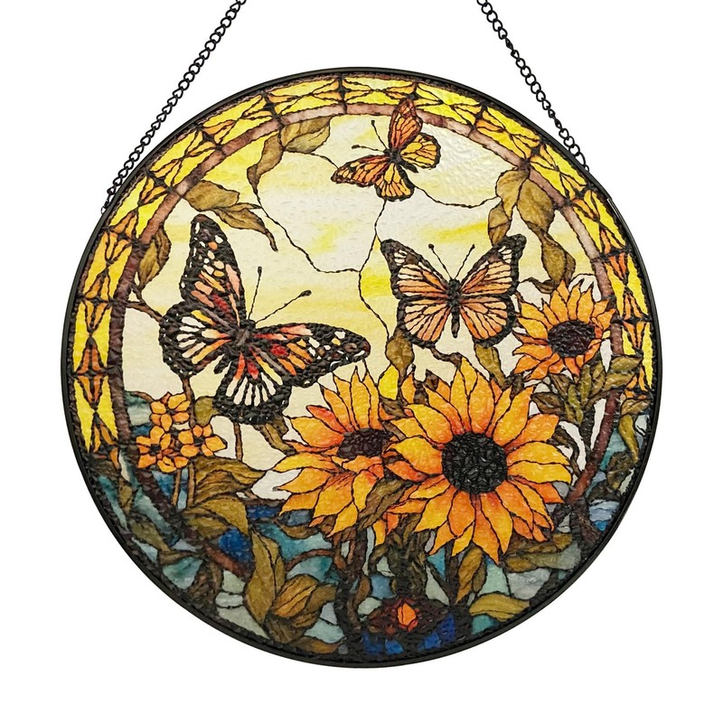 - 【SUNFLOWER STAINED GLASS PANEL】Our stained glass window hangings with butterflies and sunflowers express the harmonious beauty of nature. When the sun shines, the colors are more vibrant and the patterns on the glass panels come alive, making them more colorful and in tune with nature's style. It is a stunning glass decorative painting and a unique and creative home decoration.
