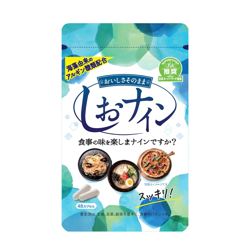 ○商品名 アルギン酸類配合サプリメント しおナイン ○商品説明 ・しおナインは食事をポジティブにする新しいタイプのサプリメントです。 ・カリウムをほとんど含まない(1カプセルあたり0.22mg)ため、カリウムの摂取が気になる方にも安心です。 ・玉ねぎの成分と海藻より抽出したぬめり成分のWパワーで食事をポジティブにします。 ○ご使用方法 食事の前や後などに1回3カプセル・1日1~3回を目安に水などと一緒にお召し上がりください。 〇こんな方におすすめ ・食事の味を楽しみたい ・食事でモヤモヤする ・いろいろ気になって楽しめない ○栄養成分表示 3カプセル当たり ■3カプセルあたり エネルギー3.01kcal、たんぱく質0.12g、脂質0.004g、炭水化物0.62g、食塩相当量0.006g ○原材料名 玉ねぎパウダー(国内製造)/アルギン酸Ca、アルギン酸アンモニウム、HPMC、セルロース