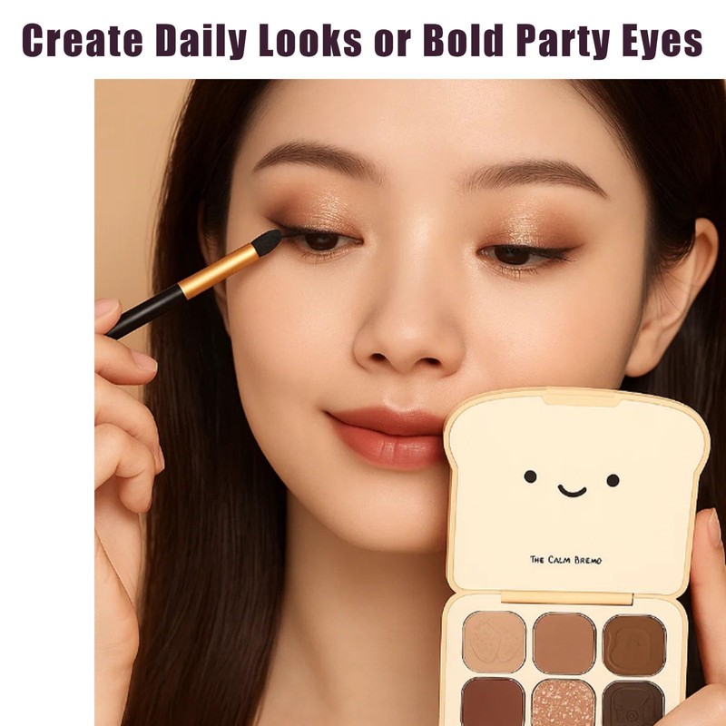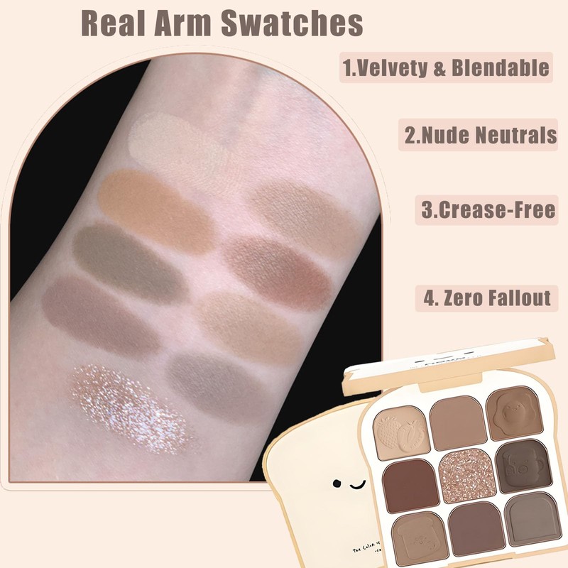 - 🌟[Cute Toast Design Palette] This 9-color eyeshadow palette comes in a creative toast-shaped case with embossed cartoon patterns, making it fun and stylish. The compact and playful design is not only practical but also a great gift choice for women and girls.