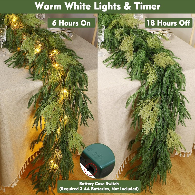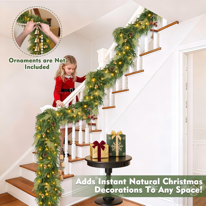 - Prelit 50 Warm Lights: This Christmas real touch cedar garland is prelit with 50 LED warm white lights, operated by batteries (not included). You can aslo DIY this pine garland, such as decorate bells, balls, pinecones ornaments with it to fit your space