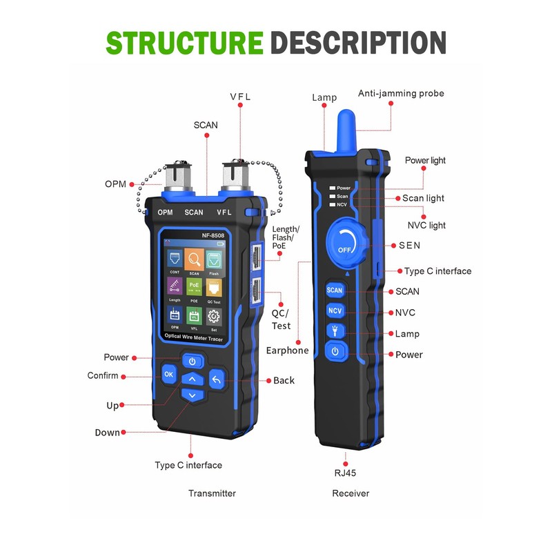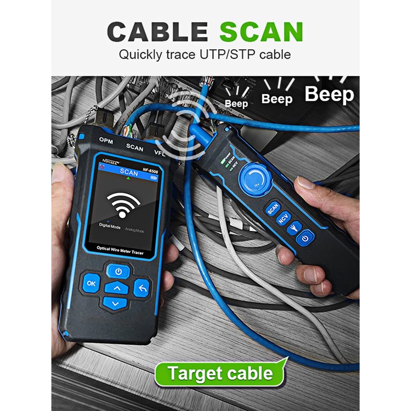- 9 in 1 Multifunctional Network Cable Tester: Continuity testing, cable scan, port flash, length measurement, POE Test, QC testing, optical power meter, VFL function, and NVC function. Without complicated device configurations, you can efficiently perform a wide variety of connection tests with just a single press of a button.