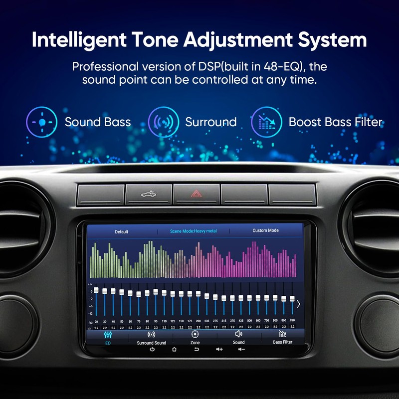 - 【48-EQ (Voice point touch control) +Professional DSP】Adjust the position of the voice point according to the seat. Enjoy pure timbre bring happiness (exclusive), including Normal, Jazz, Pop, Classical, Heavy Metal, Vocal, Soft is 7 kinds of Sound, 6 kinds of Surround Sound pattern, Bass Boost and any single speaker volume control, etc., Very powerful single console, perfect for long-term drivers.