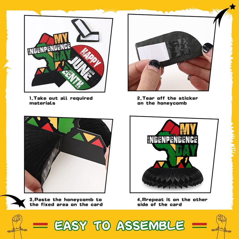 - How to Use: these Juneteenth themed party decorations have an area where the honeycomb can be assembled; Tear off the sticker on the honeycomb, then paste the honeycomb to the fixed area on the card, and then repeat the above steps on the other side of the card
