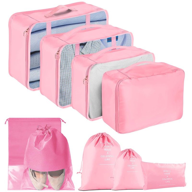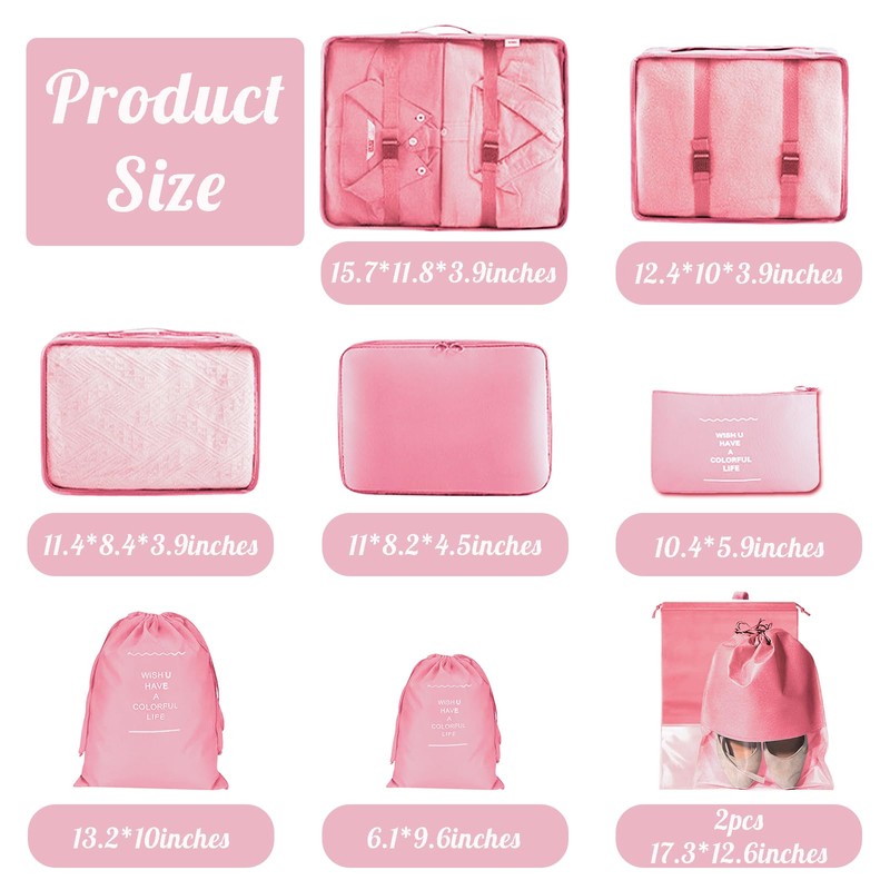 - 9 Pcs Travel Packing Organisers Set: include 3 travel packing cubes with see through mesh, 1 private cubes for bras and underwear, 2 shoes bag, 2 drawstring dirty bag, 1 flat pockets for socks, electronic accessories or keys. The travel organizer keeps your clothes, shoes, toothbrushes, toiletries, dirty clothes and more neat and organized, so that your suitcase space can be fully utilized for all your travel needs.
