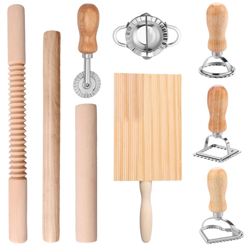 - 9 Pieces Set This pasta set includes 9 tools, including 1 dumpling maker, 1 rolling pin, 1 gnocchi board, 1 threaded rolling pin, 1 dough cutter, 1 small rolling pin and 3 different shapes of ravioli cookie cutters, covering a range of production requirements.