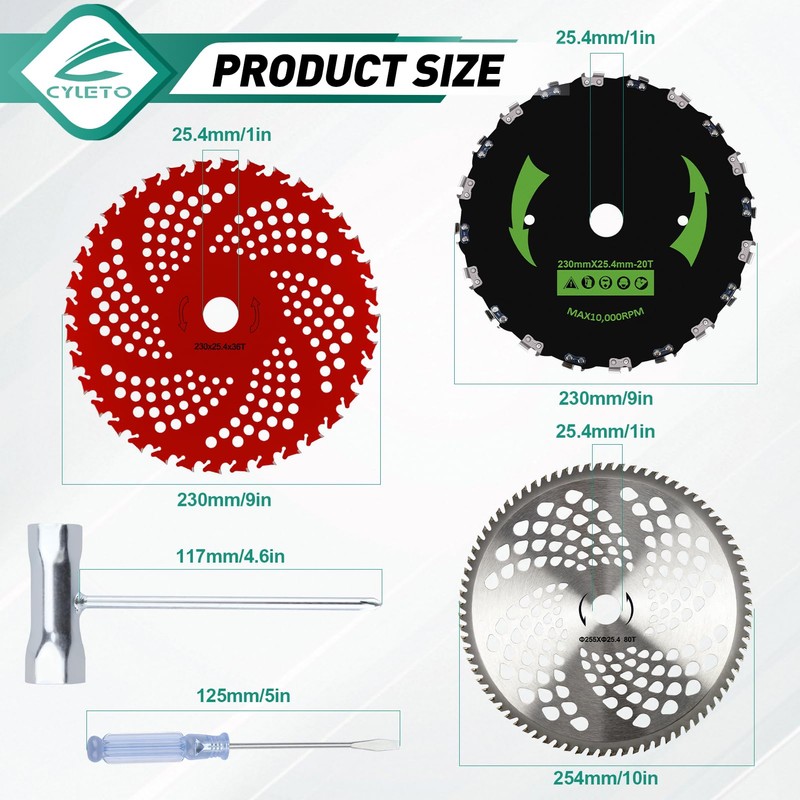 - This 10" x 80T Carbide Tip Brush Cutter Trimmer Blades & 9" x 36 Teeth Carbide Tipped Blades & 9"x 36 Teeth Carbide Tipped Blades has a 1-inch(25.4mm) hole in the center, which is suitable for most straight shaft gas trimmer with 1 inch(25.4mm) gear case.