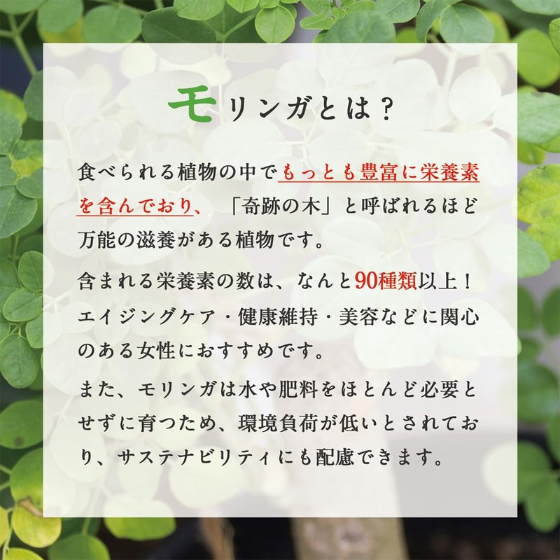 - ✅【モリンガとは?】食べられる植物の中でもっとも豊富に栄養素を含んでおり、「奇跡の木」と呼ばれるほど万能の滋養がある植物です。