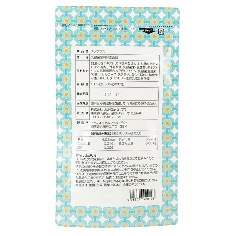 - 「ナノ型乳酸菌」「ラクリスS(生きてる乳酸菌)」「難消化デキストリン」「ビフィズス菌」「ビタミンD」を配合しています。