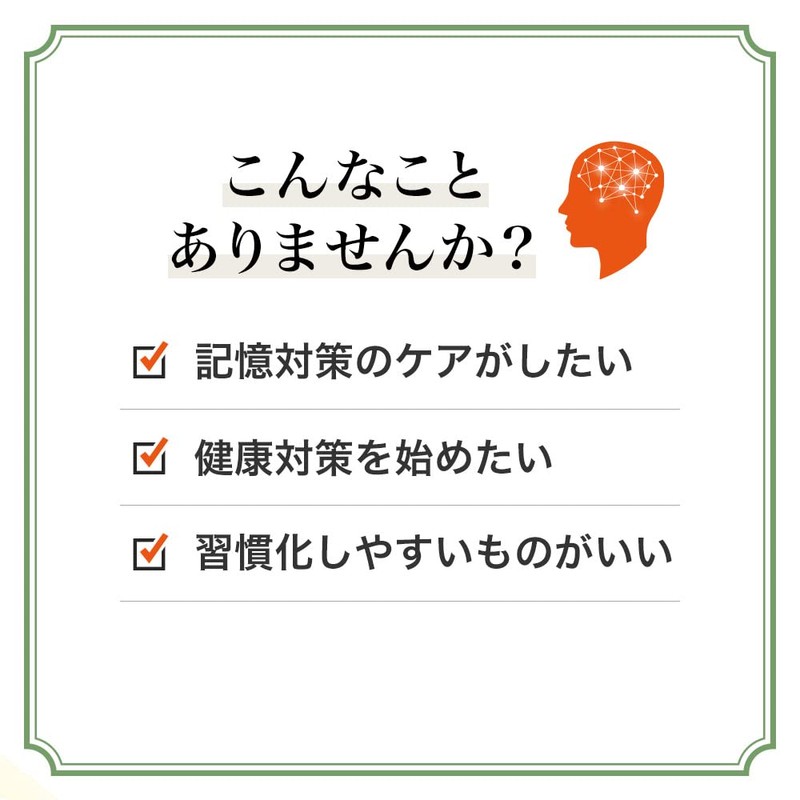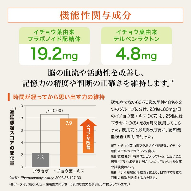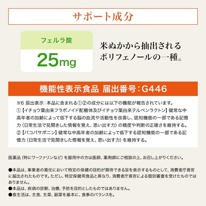 食生活は、主食、主菜、副菜を基本に、食事のバランスを。【機能性表示食品届出番号】G446 【届出表示】本品に含まれる①②の成分には以下の機能が報告されています。①【イチョウ葉由来フラボノイド配糖体及びイチョウ葉由来テルペンラクトン】健常な中高年者の加齢によって低下する脳の血流や活動性を改善し、認知機能の一部である記憶力(日常生活で見聞きした情報を覚え、思い出す力)の精度や判断の正確さを維持する。②【バコパサポニン】健常な中高年者の加齢によって低下する認知機能の一部である記憶力(日常生活で見聞きした情報を覚え、思い出す力)を維持する。【機能性表示に伴う注意事項】●本品は、事業者の責任において特定の保健の目的が期待できる旨を表示するものとして、消費者庁長官に届出されたものです。ただし、特定保健用食品と異なり、消費者庁長官による個別審査を受けたものではありません。●本品は、疾病の診断、治療、予防を目的としたものではありません。●本品は、疾病に罹患している者、未成年者、妊産婦(妊娠を計画している者を含む。)及び授乳婦を対象に開発された食品ではありません。●疾病に罹患している場合は医師に、医薬品を服用している場合は医師、薬剤師に相談してください。●体調に異変を感じた際は、速やかに摂取を中止し、医師に相談してください。