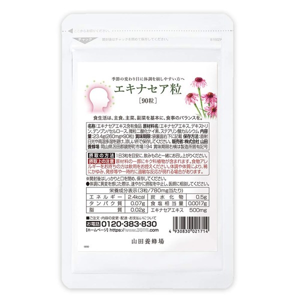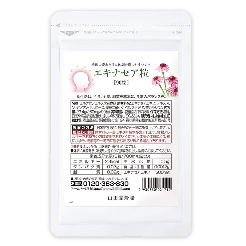 - 1日摂取目安量3粒(780mg)あたり2.4キロカロリー、タンパク質:0.07g、脂質:0.02g、炭水化物:0.5g、食塩相当量:0.0017g、エキナセアエキス末:500mg