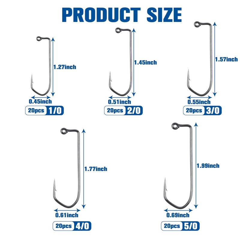 - 【100pcs Hook Kit】1/0-20pcs, 2/0-20pcs, 3/0-20pcs, 4/0-20pcs, 5/0-20pcs. Different sizes can meet your different needs. Packged in a reusable plastic box, easy to store and carry.