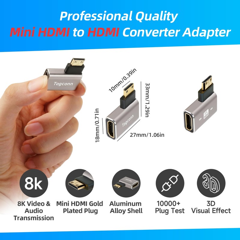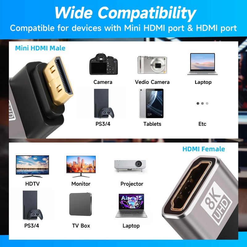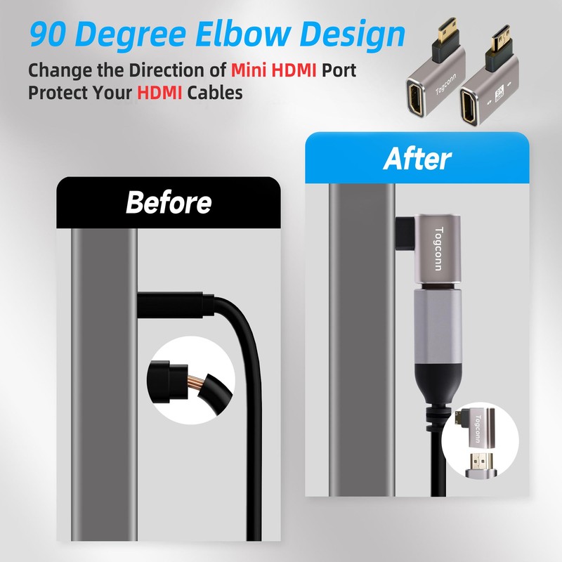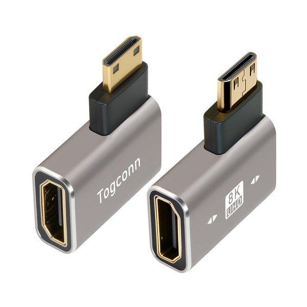 - 90 Degree Mini HDMI to HDMI Adapter 2 Pack, Flat Right Angle (Left and Right) Angle Mini HDMI Male to HDMI Female L-Shaped Converter Connector Support 8K@60Hz,4K@120Hz for Raspberry Pi Zero, Monitor