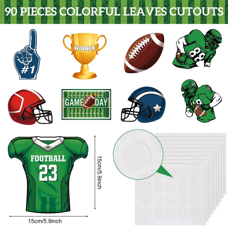 - Small Football Cutouts Quantity: 90 pcs football cutouts 9 styles, 10 for each, and with 9 sheets paper adhesive dots 20 pcs for each paper, including number one sign, trophy, football, red and blue helmet, game day sign sports cutouts decorations, 2 styles football players, jersey, with 180 adhesive dots, enough quantity to decor and create a strong football theme party decorations atmosphere