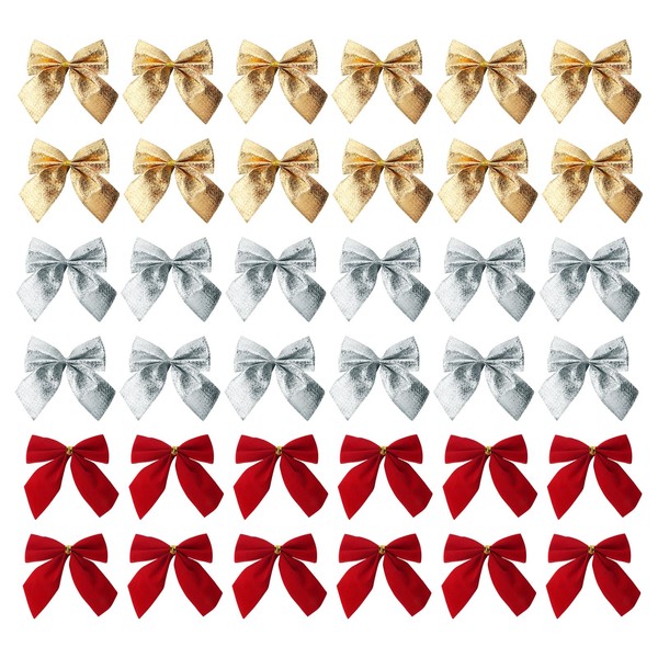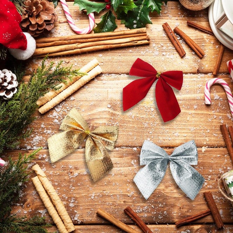 >>Unique Design: These ribbon bows have slightly different surfaces, with the red bows having a delicate tactile surface and the silver and gold bows having a smooth, shiny surface, making them an ideal color combination.
