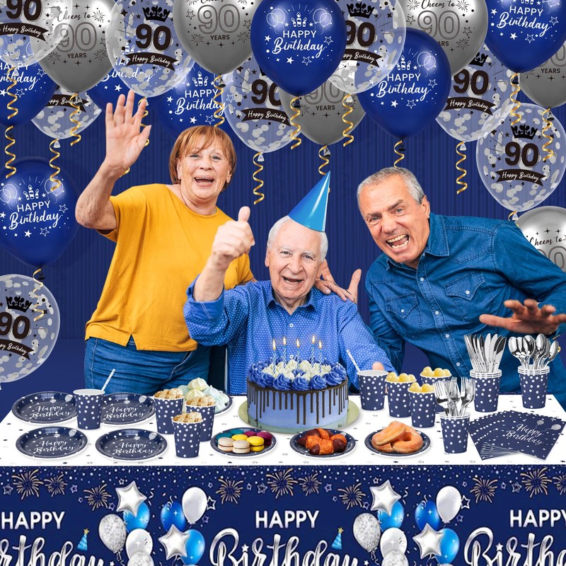 - Blue 90th Birthday Party Supplies: This navy blue 90th birthday decorations set are designed stars and balloons on navy blue color with happy birthday elements makes the 90th birthday party supplies more vivid and charming; The blue silver 90th birthday banner balloon set, combines with silver foil curtain backdrop and navy blue silver tablecloths plates cups napkins party dinnerware set to decorate your birthday party, which can make your birthday warm and unforgettable