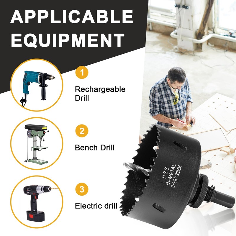 - Application of the circular hole cutter: the circular hole cutters are suitable for drilling round holes in wood, plastic, steel, cast iron, copper, aluminium. They are perfect cutting tools to install the recessed lights in the ceiling or floor to mount the ventilation pipes or exhaust fans into the wall, also to install the socket and connection cable into the desk or drywall.