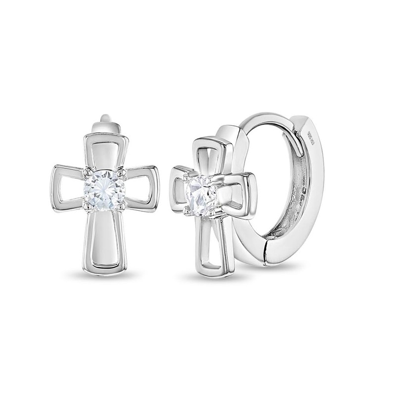 925 Sterling Silver Clear Cubic Zirconia Open Cross Huggie Hoop Earrings For Little Girls & Young Teens 11mm - Adorable Religious Gift Perfect For Christening & Baptism