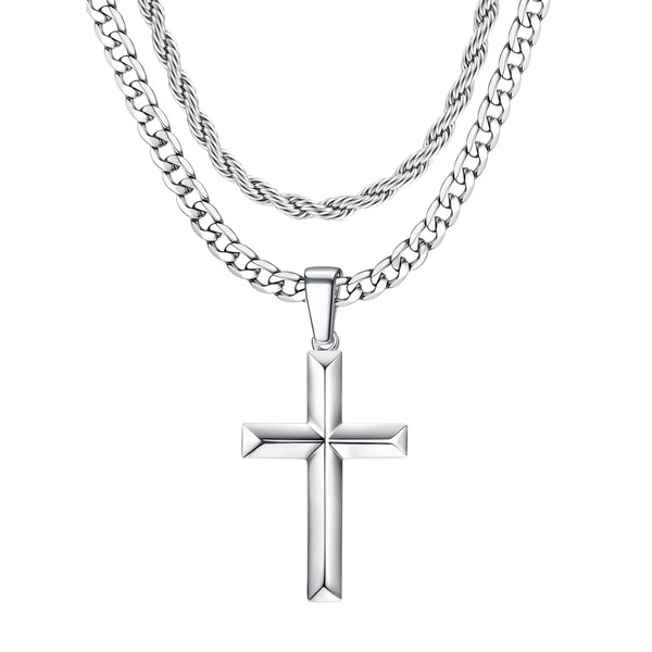 925 Sterling Silver Cross Necklace for Men Women - Stainless Steel Diamond Cut Cuban Link Rope Chain Layered Cross Pendant Necklaces Jewelry 20&22 Inches