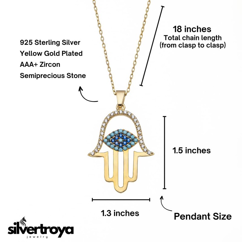 925 Sterling Silver, Hamsa Hand Evil Eye Necklace, Gold Plated, Blue Turquoise Zirconia Pendant