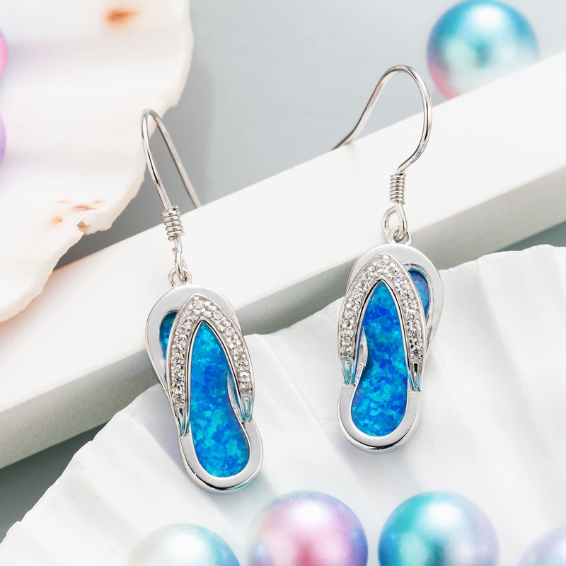 925 Sterling Silver Hawaiian Flip Flop Slipper Sandal Dangle Earrings, Genuine Koa Wood Blue Opal Abalone Shell Cubic Zirconia, Nickle Free Hypoallergenic for Sensitive Skin, Gift Box Included,
