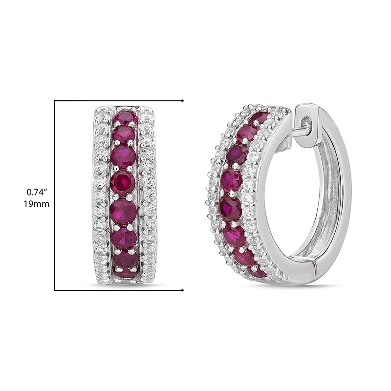 .925 Sterling Silver, Lab Grown Red Ruby & Lab Grown White Sapphire 3/4" Triple Column Huggie Earrings