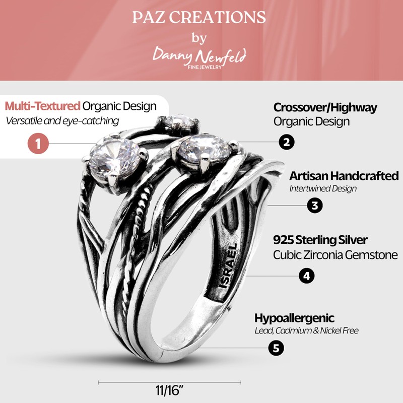 925 Sterling Silver Ring For Women By Paz Creations, Elegant Cubic Zirconia Gemstone Ring, Hand Crafted Intertwined Design, Multi-textured Ring For Women, With 1 Year Warranty, Size 7