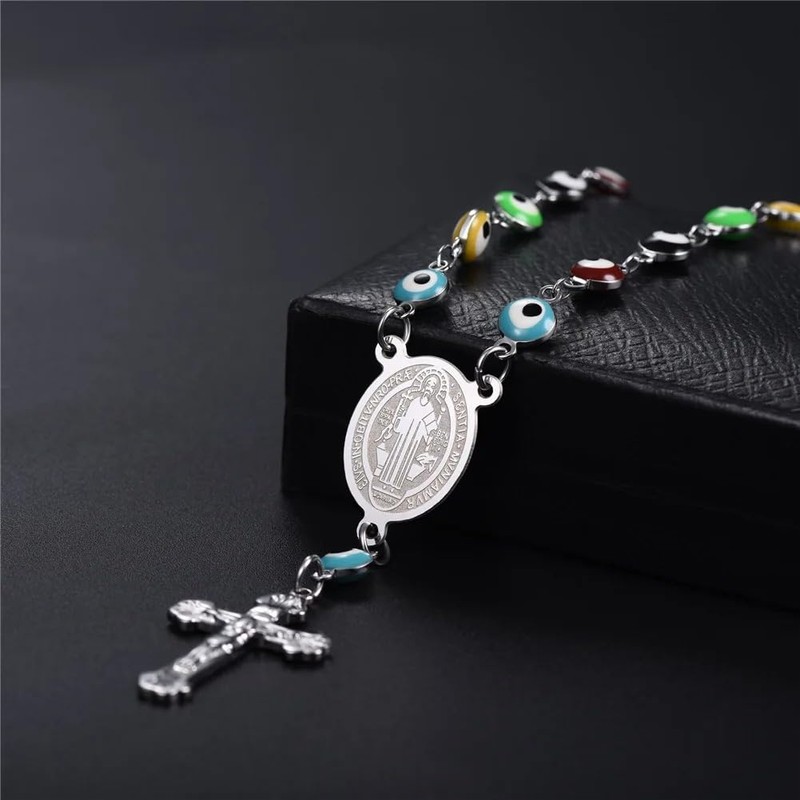 925 Sterling Silver Saint Benedict Necklace Evil Eye Beaded Rosary Necklace Women Link Chain 18K Yellow Gold Saint Benedict Medal Cross Necklace medalla de san benito de plata Jewelry Medals, Silver,