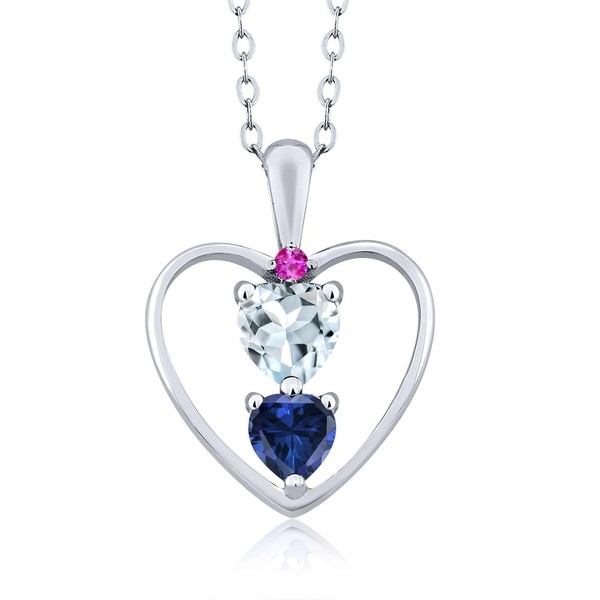 925 Sterling Silver Sky Blue Aquamarine Blue Created Sapphire and Pink Sapphire Pendant Necklace For Women (0.92 Cttw, Gemstone March Birthstone, Heart 5MM and 4MM, with 18 Inch Silver Chain)
