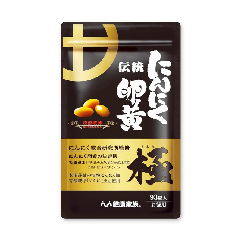 【健康家族】伝統にんにく卵黄 極 93粒入 ピュアDHA オメガ3 九州産有機にんにく王 にんにく成分「GSAC」 アリイン EPA DPA ビタミンB1 有精卵黄 国内GMP認定工場 特許取得
