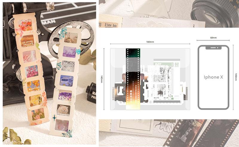 🎞MULTI-MATERIALS GREAT VALUE PACK - 20pcs film PET stickers has 10 patterns, 2pcs of each pattern, size within 1.2 x 6.8 inches. 20pcs cutouts carft cards, the size is within 2.4 x 6 inches. 8pcs balck photo frame stickers has 4 patterns, 2pcs of each pattern.