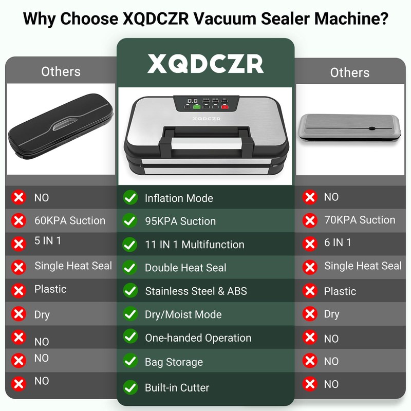- 【95kPa Dual Pump Power】Experience stronger suction with 95kPa dual pump technology, delivering an vacuum seal in just 8–18 seconds—up to 50% faster than standard vacuum sealer for food . This high efficiency not only keeps meat, seafood, vegetables, and dry goods fresher for longer, but also helps you reduce food waste, cut grocery costs, and maximize refrigerator and freezer space.