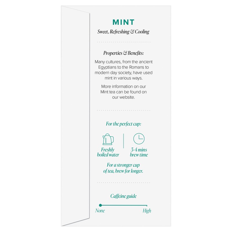 - MINT TEA - Our Mint tea has a mellow sweetness that is both refreshing and soothing with a wonderful rounded aroma. We take inspiration from the much loved Moroccan mint tea and also use spearmint which has a more refined flavour. Our mint tea is caffeine free so it is perfect at any time of the day.