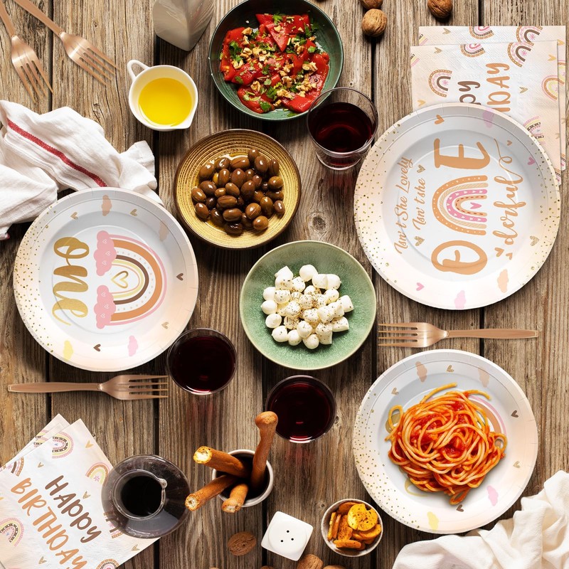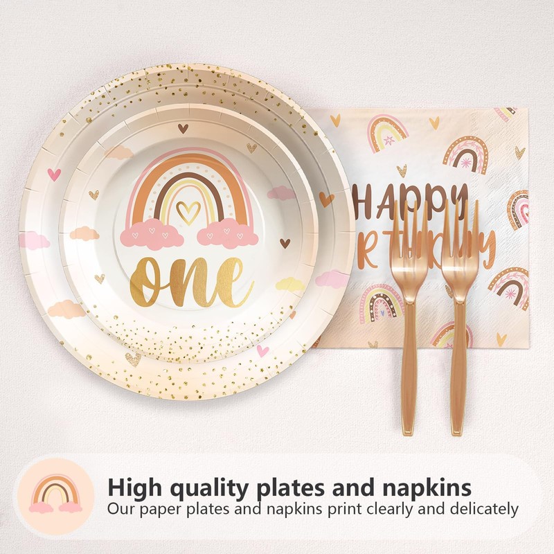 96 PCS Boho Rainbow 1st Birthday Party Supplies 350 GSM Onederful Plates Napkins Tableware Set Isn't She Onederful Birthday Decor for Girl First Birthday Baby Shower Bohemian Party Serves 24