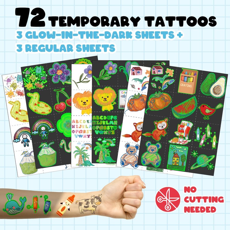 • 🌙 [72 TEMPORARY TATTOOS] Glow-in-the-dark crayons, colorful rainbows, doodle animals, and more! Includes 6 glow + 6 regular sheets, all pre-cut, skin-safe, and super easy to apply and remove.