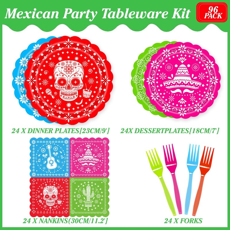 - 【Fiesta Party Plates】You will get 96pcs Mexican fiesta tableware, including 24pcs 9” Cinco De Mayo plates, 24pcs 7” plates, 24pcs napkins, and 24pcs plastic forks. The Mexican dinnerware set serves 24 guests.