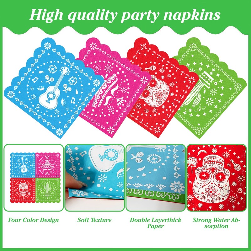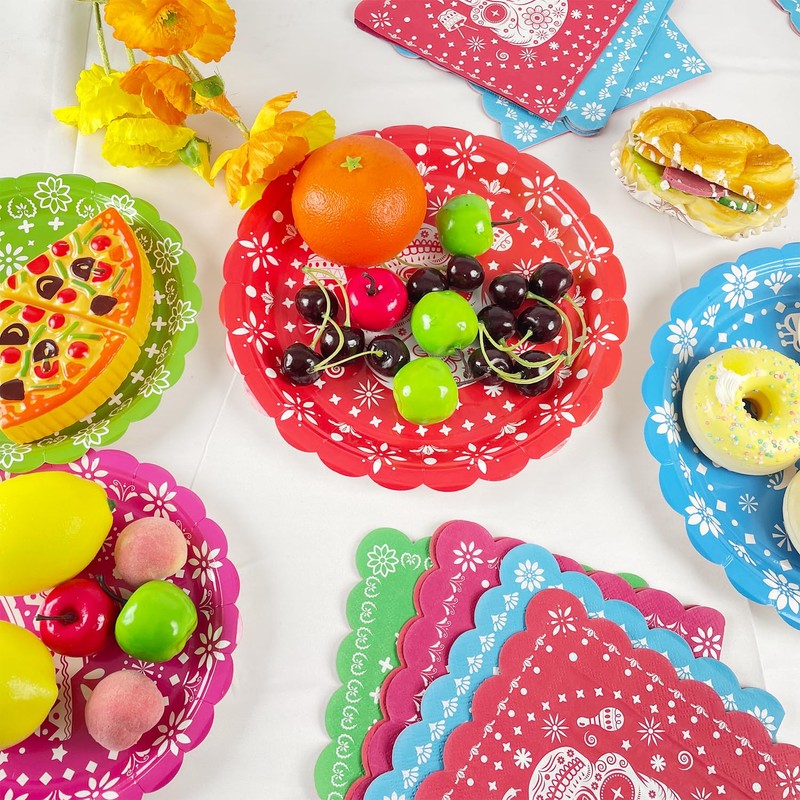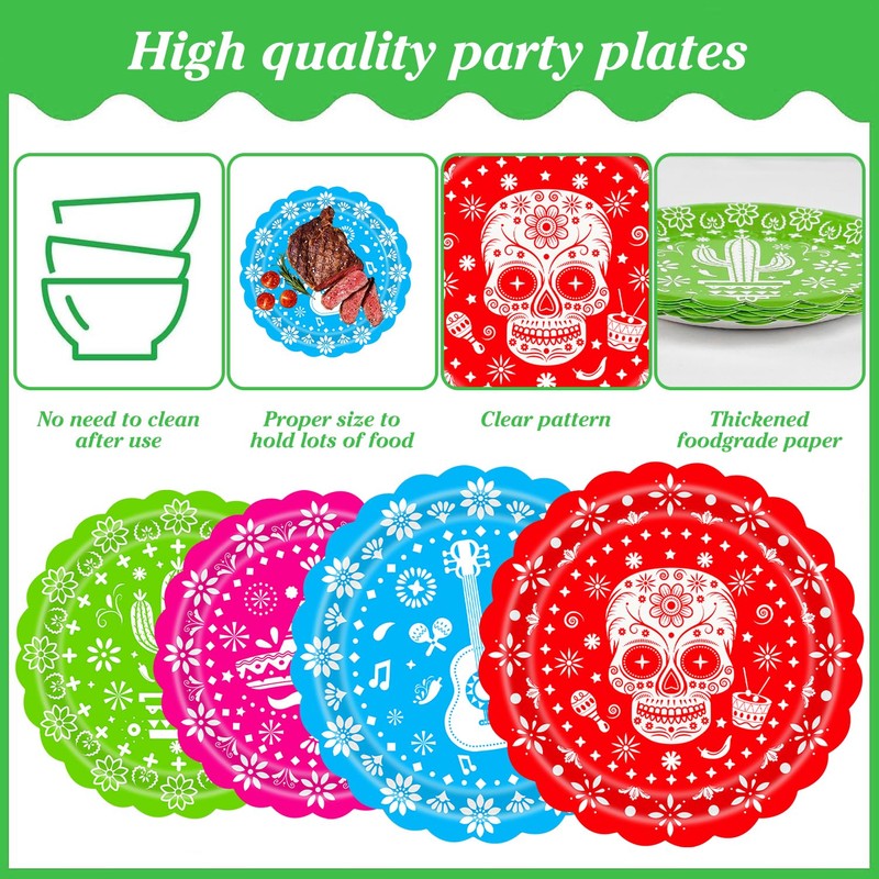 - 【Premium Quality】Mexican Fiesta Dia De Los Muertos paper plates are made of thick and durable material that is environmentally safe, waterproof and non-harmful to the body; Mexico napkins are tough and soft; the Mexican Fiesta party supplies printed pattern is clear color printing, not fade.